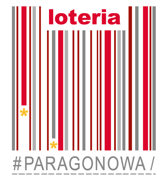 paski w kolorze czerwonym, białym i siwym biegnące z góry na dół i napis loteria paragonowa