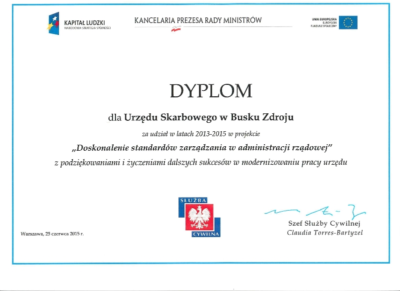 W czerwcu 2015 roku zakończył się projekt „Doskonalenie standardów zarządzania w administracji rządowej" współfinansowany ze środków Unii Europejskiej w ramach Europejskiego Funduszu Społecznego. Urząd Skarbowy w Busku-Zdroju był uczestnikiem tego projektu.